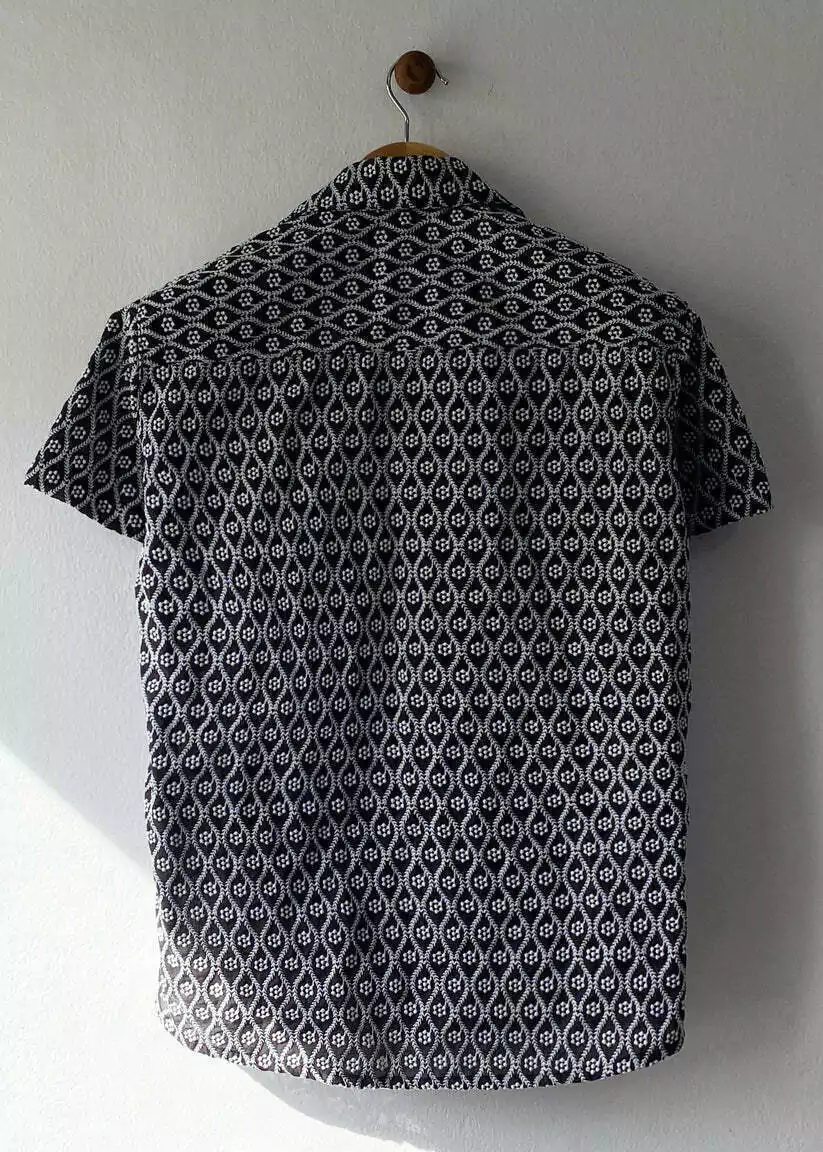 Peça estampada, levemente acinturada, com manga curta e fechamento com botões.